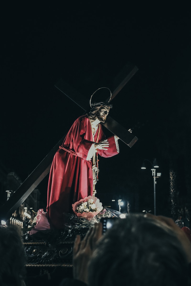 a statue of jesus carrying the cross in the darkJour de la mort de JĂ©sus-Christ 18h Chemin de Croix dans la rue autour de notre paroisse Saint Antoine de Padoue et en mĂŞme temps aura lieu un Chemin de Croix dans l’Ă©glise pour ceux qui ne peuvent se dĂ©placer. Puis Ă  la fin sera cĂ©lĂ©brĂ© l’Office de la Passion Ă  19h
